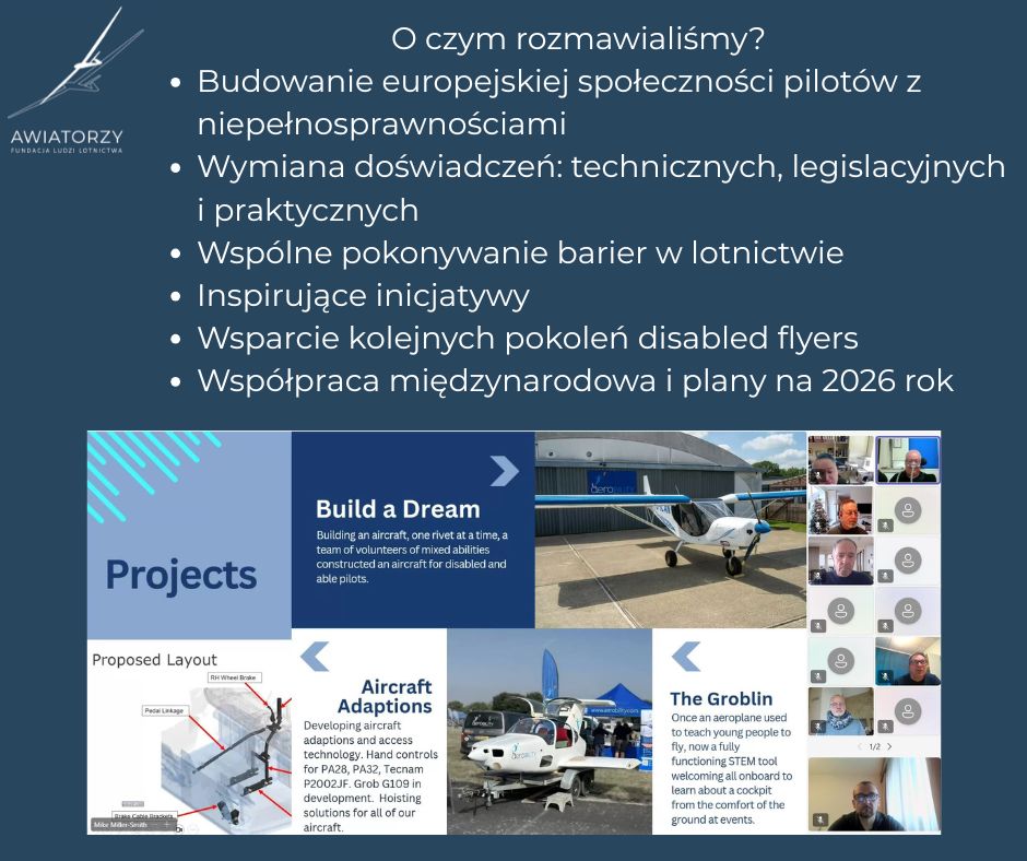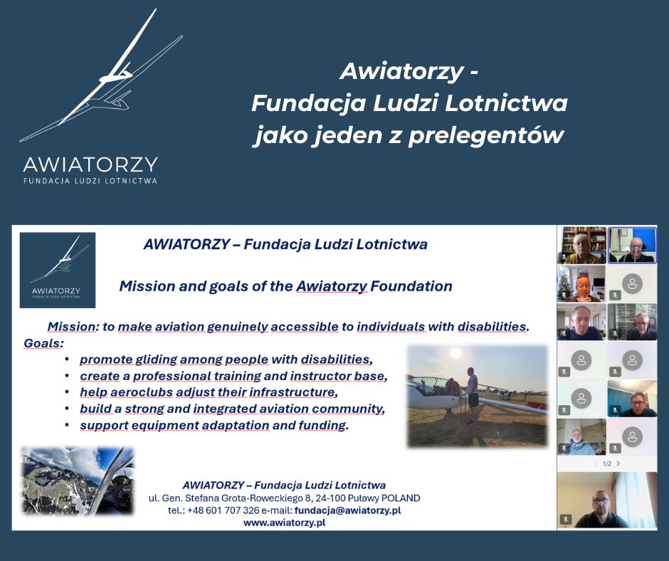 Z dumą informujemy, że polscy piloci z niepełnosprawnością reprezentowani byli przez prezesa Awiatorzy – Fundację Ludzi Lotnictwa w dniu 11. grudnia 2025 roku podczas European Disabled Flyers Symposium, międzynarodowym wydarzeniu skupiającym organizacje i pasjonatów lotnictwa, działających na rzecz dostępności latania dla osób z niepełnosprawnościami w całej Europie.